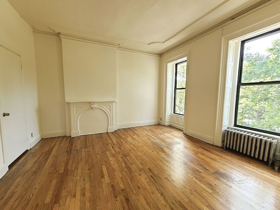 No FEE- Rent Stabilized 1 Bedroom with High ceilings and great lighting Shorter term rental available This Fort Greene townhouse 1 bedroom apartment is on the third floor of a walk up building. High ceilings of 10 foot throughout the living areas. Decorative fireplace and lots of detailed molding on walls, ceiling and window frames. The living room and bedroom face the west and have great light coming through large windows. Facing Clermont Ave, trees are in your immediate view, making it feel like you are in a treehouse. Bedroom can fit a full size bed horizontally with additional furniture or a queen bed on the long side There is a large closet off the living room and a huge private storage bin in the basement. Heat and hot water is included. Pets are welcomed *Video available upon request