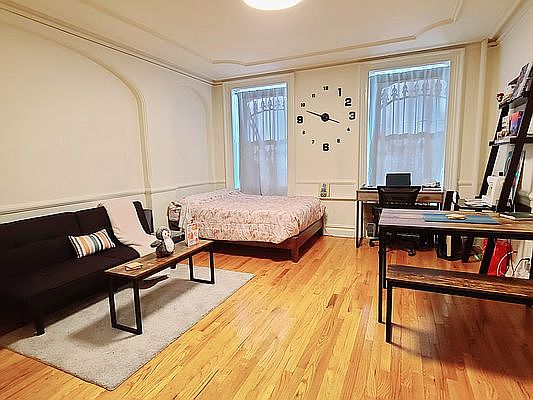Renovated Studio from top to bottom in a beautiful Fort Greene townhouse Large open space to create your sleeping and living area as you like. The Kitchen has custom cabinetry with lots of storage and all high end stainless steel appliances; Liebherr fridge/freezer, dishwasher, built-in microwave and granite counter-tops. An extra counter with cabinets next to the closet can be made into a coffee bar and to store all your small personal items. Fully tiled bathroom with a rainshower and also custom cabinetry. Custom crown, picture and chair rail moldings and hardwood floors Large private locked storage unit in the basement. Pet friendly building. Heat and hot water are included. *Furnished pics of current and past tenant for reference of space
