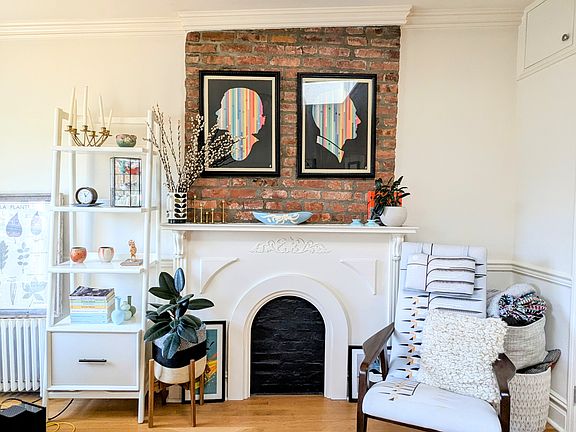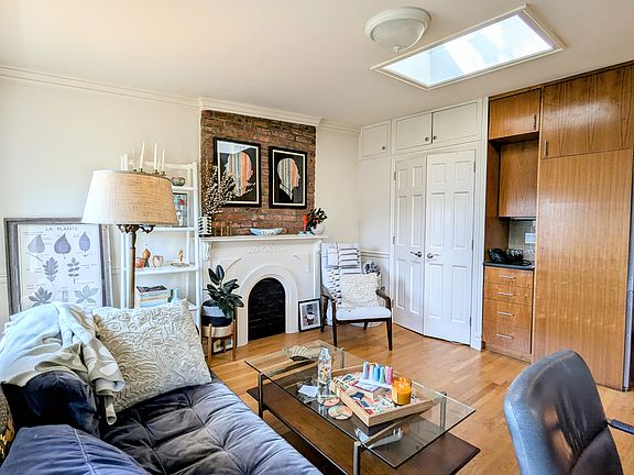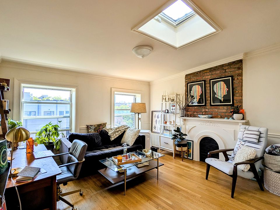 Beautifully renovated 1 bedroom in Fort Greene tree lined block. Lots of natural lighting with 2 skylights. Located on the top floor of a walk up brownstone building, this apartment has a lot to offer. Renovated by a master carpenter, great details include a Decorative fireplace with exposed brick wall and 2 skylights in the apartment. Kitchen has custom cabinetry with lots of storage and high end stainless steel appliances; Liebherr fridge/freezer, dishwasher, built-in microwave and granite countertops. Fully tiled bathroom with huge custom cabinetry and skylight. Custom crown, picture and chair rail moldings and hardwood floors. Custom woodwork around the windows. Extra storage above closet. Lots of natural lighting from windows in each room. The bedroom measures approx 7'6" x 12'6' and will fit a queen size bed comfortably plus additional furniture. Large private storage bin included in the basement. Pet friendly building. Dogs on approval. Heat and Hot water included. Located in Beautiful Fort Greene near the park, transit plus various cafes, restaurants and retails stores.