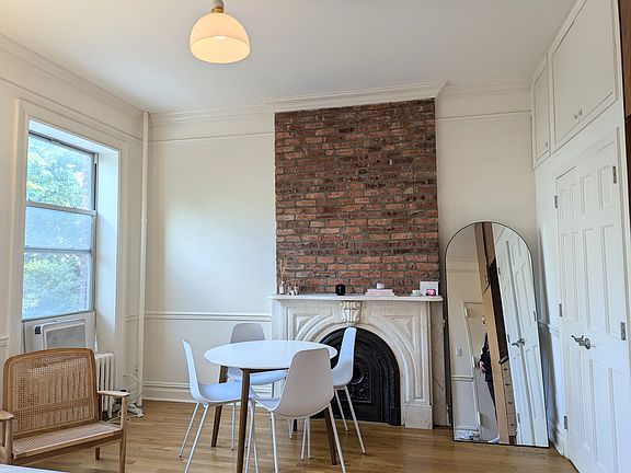 Welcome home to this 1 bedroom apartment on the 3rd floor of a walk up in a beautiful Fort Greene townhouse. Renovated by a master carpenter, great details include a Decorative fireplace with exposed brick walls. High ceilings of 10' opens up the space and provide for extra storage above all the closets. Kitchen has custom cabinetry with lots of storage and high end stainless steel appliances; Liebherr fridge/freezer, dishwasher, built-in microwave and granite countertops. Fully tiled bathroom with huge custom cabinetry. Custom crown, picture and chair rail moldings and hardwood floors. Custom woodwork around the windows. Lots of natural lighting from windows in each room. The bedroom measures 6'9"x 11'6" and fits a queen size bed plus additional furniture. Large private storage bin included in the basement. Pet friendly building. Dogs on approval. Heat and Hot water included. Located in Beautiful Fort Greene near the park, transit plus various cafes, restaurants and retails stores.