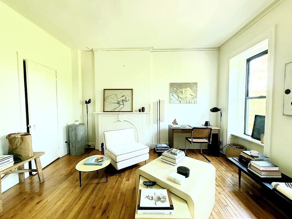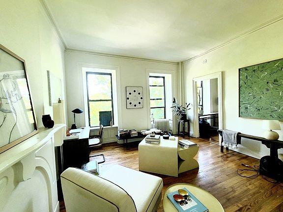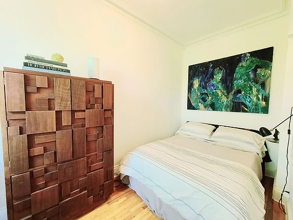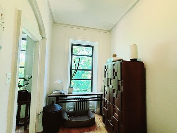 This Fort Greene townhouse 1 bedroom apartment is on the fourth floor of a walk-up. The living room and bedroom face the west and have great light through large townhouse windows. Facing Clermont Ave, trees are in your immediately view, making it feel like you are in a treehouse. High ceilings almost 10 foot throughout the living areas. Bedroom can fit a queen bed with additional furniture. Measures 7' x 13'6" There is a large closet off the living room and extra private storage bin in the basement. Heat and hot water is included. Pets are welcomed *Video available upon request