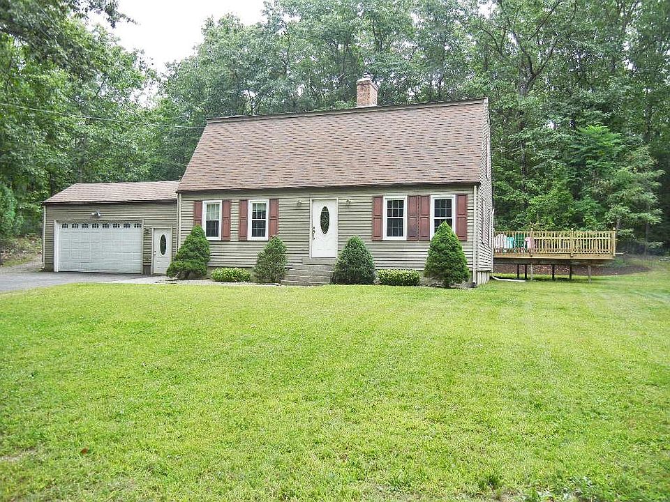 Located on a beautiful wooded 3 acre lot this gambrel style home may be just what you have been looking for. First floor features include a large eat in kitchen, living room with fireplace, first floor bedroom and laundry with half bath. Upstairs are two more large bedrooms and a full bath. The basement has been partially finished with one good sized room and an attached half bath leaving plenty of workshop and storage space. Outside there is an attached two car garage, screen porch and large deck. Enjoy easy access to the highway, shopping and conservation land from this location.