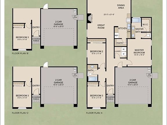 The Carmelo(1500 sq. ft.) is a 1-story home with 3 bedrooms, 2 bathrooms and 2-car garage. Features include dining room & great room. No HOA. Photos are renderings of a model.