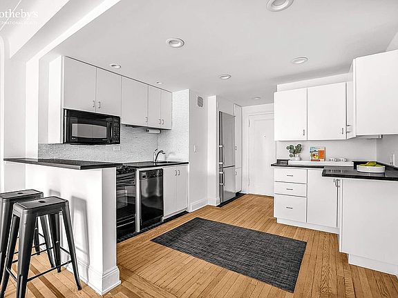 The renovated cook’s kitchen offers breakfast bar dining, new stainless full-size Liebherr refrigerator, Miele dishwasher, gas range, recessed and under-cabinet lighting and black granite counters. A gallery hallway includes a coat closet, built-in linen closet and display shelving, and leads to the windowed bath and graciously proportioned primary bedroom featuring walk-in closet and sunset garden views. The floor-plan is simply divine and a perfect lifestyle for working, relaxing or entertaining. Also included are Hunter Douglas Blinds so you can move right in. Hands down, the C-line is the premier one-bedroom line in Gramercy House offering both sunshine and serenity.