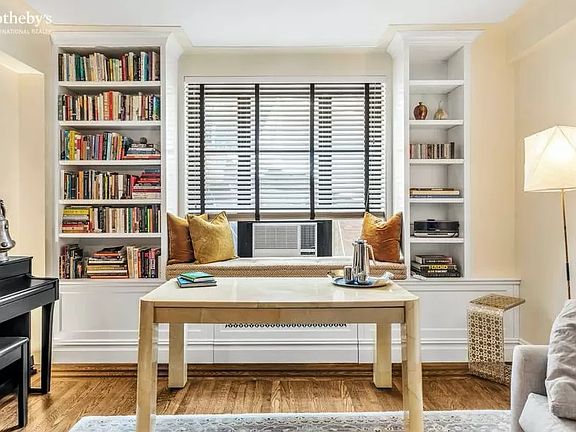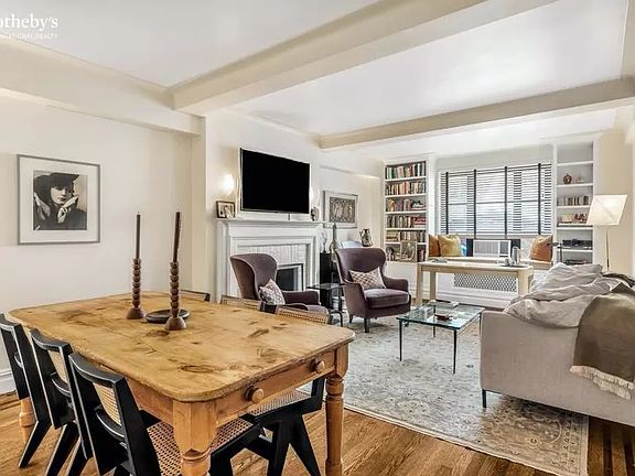 Step back in time when you enter this sun-filled, garden view 1 bedroom at art deco Gramercy House. The apartment has a gracious square entry foyer and generous coat closet. There are high beamed ceilings, inlaid hardwood floors, a wood burning fireplace and a cozy window seat overlooking the garden in the living room. A separate hall leads to the bedroom suite. Gramercy House is a full-service doorman building with an on-site concierge. The apartment maintenance includes electricity, air conditioning and heating. Residents share a private landscaped garden and a dramatic roof terrace with panoramic views. There is a laundry room, storage lockers and bicycle storage. The Coop Board allows one dog per apartment. There are no restrictions on cats. Maximum financing is 60%. The Coop Board requires the apartment to be a primary residence (no pied a terres). Gifts are allowed, but no co-purchasing or parents buying for children. Please note, garden views temporarily obscured by scaffolding during facade renovation.