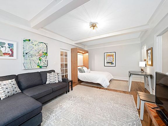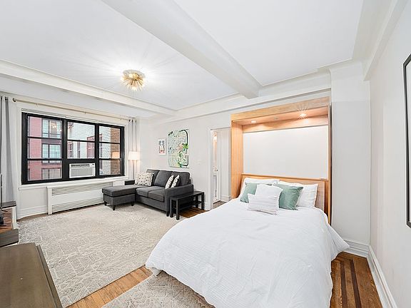 A large studio at the much sought-after Gramercy House on East 22nd Street. The studio is one of the largest in the building with an eat-in kitchen and the ability to open up the large dressing room to create a sleeping alcove. It has a very spacious and versatile lay-out. Gramercy House is an architecturally significant art deco building, a block and a half from Gramercy Park, and within easy distance of Union Square, the Flatiron district and the East Village. The main room is 13' x 19' with large north facing windows, the dining area is 6' 4" x 7' 8" There is a windowed bathroom and kitchen. The apartment retains pre-war details including the original hard-wood floor with an elegant inlaid border and a beamed ceiling. There is a hall closet and storage in the dressing room area. The building has an outstanding and professional staff and super, with a 24 hour concierge, a doorman in the afternoons and evenings, a roof deck with spectacular views and a beautiful private garden for the exclusive use of the residents. There is a laundry room and bicycle storage. The coop permits one dog per apartment and cats (no limit), it does not permit pied a terre buyers. Gifts to assist with the purchase are allowed, but parents buying for their children or co-purchasing with their children is not allowed. The maintenance includes electricity (including A/C) and heating. Maximum financing 75% of the purchase price.