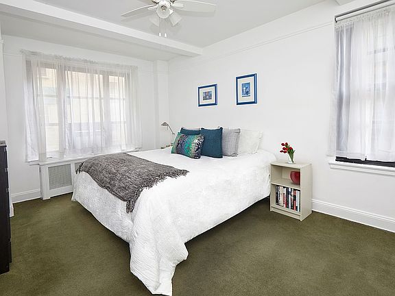 This spacious apartment also has an eat-in windowed kitchen with lustrous granite countertops and a ceramic and stainless steel backsplash; it also features white wood cabinets, plenty of storage and GE profile and Kenmore appliances.
