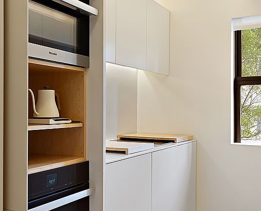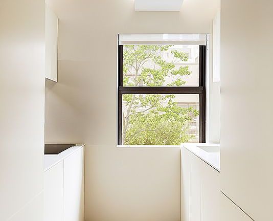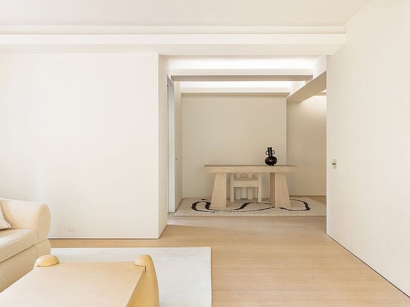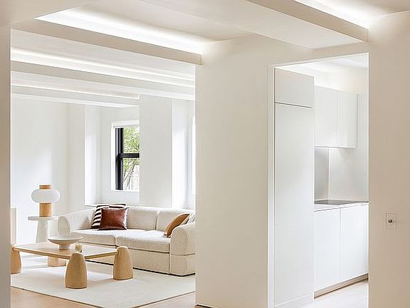 This move-in-ready, designer residence has been meticulously planned and renovated to museum-quality standards. Every detail has been thoughtfully considered, blending pre-war charm with crisp modern elegance. Features like shadow gaps, flush-wall outlets, and invisible switch plates create a seamless aesthetic, while hidden ambient lighting allows the space to softly glow, evoking a true sense of tranquility. The windowed kitchen is a masterpiece of design, with all-Miele appliances discreetly concealed behind custom panels, including a knock-to-open dishwasher, double ovens, and an induction cooktop. Corian countertops and backsplash with an integrated sink, paired with off-white matte lacquer cabinetry, make this kitchen feel like a work of art. The spa-like bathroom is clad in Turkish limestone, featuring a custom walk-in shower with a built-in bench, a sleek wall-hung toilet, heated flooring, and high-end Vola fixtures, creating a sanctuary.
