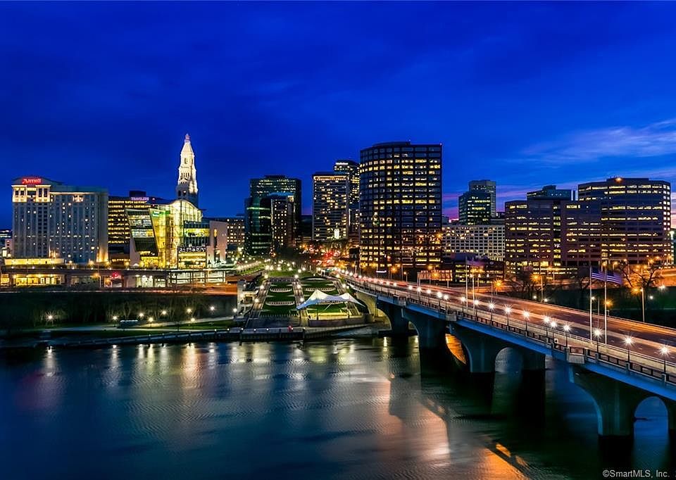 Amazing New York City lifestyle on the CT River! The picturesque views of the Hartford skyline and the river can be seen from every room in this luxury unit. It is truly special, and the condo association offers plenty of fantastic amenities. Walk into the unit and immediately feel the grandeur. The spacious and open living/dining room combo is grand with tons of windows and a balcony that allows the owner to enjoy soaking up the views. The gourmet eat-in kitchen has granite counters, custom cabinetry, a peninsula, a Sub-Zero fridge and a sink overlooking the city. The master bedroom is stunning! It has a private balcony and custom millwork, closets which are classic and great for a large wardrobe. In addition, there is a large full bathroom with double sinks and a cedar walk-in closet. There are 2 additional bedrooms and 1.5 baths. One of the bedrooms features several built-ins, which could also be used as a den/study. This HOA fee includes 3 parking spaces, heat, AC, basic cable, hot & cold water. The association has a pool, tennis courts, fitness area and several gathering areas. There is also in-unit laundry. Enjoy this sophisticated and private space and all of its high-rise building features.