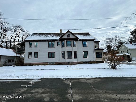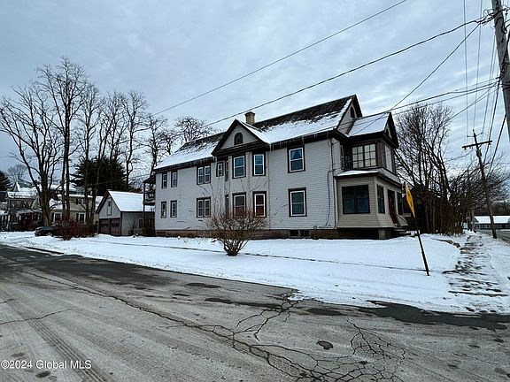 Huge 2 family home in the heart of Amsterdam. Corner lot on a dead end street. Each flat has 3 large bedrooms, eat in kitchen, dining room, living room, den/office area & storage space galore! Bright replacement windows, appliances, separate utilities & spacious front & back porches on each floor. Gas and electric has already been expanded into the full size attic for the opportunity of another large or two more small apartments or lots of storage. The dry basement features a new sewer line, 2 washer dryer hookups & workbench. The main house sits on a large lot that offers lots of green space. Another 50x105 lot is included. Heated three car garage. Easy to maintain slate roof & vinyl siding. Let the tenants pay the rent or make good income on these large flats 1,527 Sq Ft Each!!