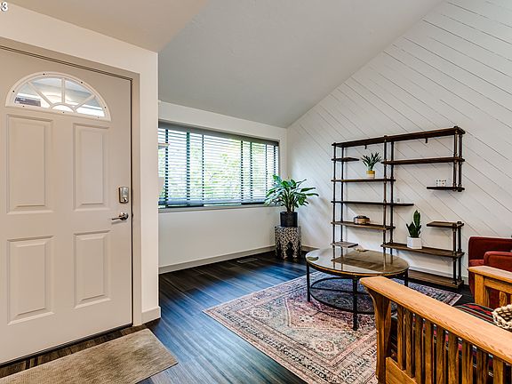 This stunning townhome offers contemporary living surrounded by nature. With beautiful views, hiking trails, and parks nearby, it's perfect for outdoor enthusiasts. Inside, enjoy natural light, vaulted ceilings, and an open floor plan. The living room features a cozy fireplace and a deck, while the kitchen boasts stainless steel appliances and quartz countertops. The primary suite has a walk-in closet, private bathroom, and balcony. There's also a second bedroom with a bathroom. Two private parking spots and a two-car garage are included. Enjoy access to the common pool and fitness center located at the Forest Village Apartments. Located minutes from Abbelone Vineyard, Spencers Butte hike, and the University of Oregon. Don't miss out on this beautiful townhome!