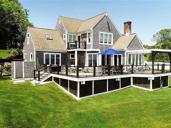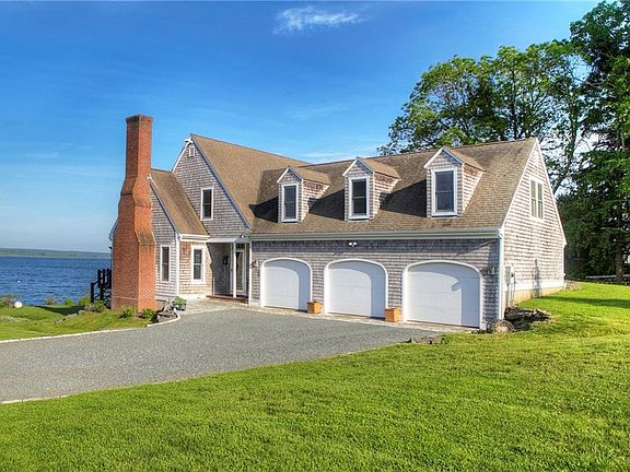 "Stone's Throw"- This breathtaking waterfront retreat, situated on just under an acre of land, is set at the end of a cul-de-sac. The residence has been recently renovated with only the finest finished materials and craftsmanship in mind.Step inside to face 180 degrees of unobstructed waterviews with a spectacular open living concept. The stunning kitchen, appointed with custom millwork, Carrara marble counters, and state-of-the-art appliances, including Sub-Zero, Wolf and Asko... faces the water's edge. The wide-plank floors make a signature statement throughout the home. The family room, with wood-burning fireplace, opens to a casual dining area surrounded by waterviews overlooking the private grounds trimmed with flowering plants and perennial gardens. The first floor is completed w/ guest bedroom with ensuite marble bath, first floor laundry and half bath. Step upstairs to the second level comprised of another guest bedroom w Carrara marble bath, bunk room, or flex space for home gym, recreation room, or home office, and a beautifully appointed master suite, completed with a magazine worthy bath. The wrap-around Brazilian nut deck, with modern stainless steel ship's cabling, facing the water is a wonderful spot for entertaining guests with the moon rising over the water. The three car garage and unfinished lower level provides plenty of space for additional storage. Beautiful stone steps to the sandy beach and 200 feet of shoreline are yours to enjoy for summer fun.
