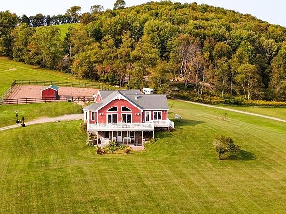 IMPECCABLE, CUSTOM BUILT Delaware County Contemporary features 3 bedrooms & 2 1/2 baths, a 2 car garage, a 3 stall horse barn, electric & wood fence corral, a large pasture & gorgeous views. Unsurpassed QUALITY construction with energy efficient Geo Thermal Radiant heat, hot water & air conditioning throughout. Bright, open living area with maple wood & Brazilian slate tile floors open to a large composite deck. The cook's delight kitchen has cherry cabinets, granite countertops & top of the line appliances. Master bedroom & bath suite again open to the views and deck. The master bath, with tumbled marble tile has a walk in shower plus a massage/soaking tub. On another level are 2 more bedrooms, one of which has a sitting area, another bathroom, a family room, a storage room, the mechanical room housing the brains of the heating/cooling system plus a walk out patio. No expense was spared with the workmanship and features of this comfortable home. Enjoy your home and your animal. You will never tire of the sunrise and sunset views from your living area, bedroom and decks. The acreage is on both sides of the road to ensure privacy. Welcome to SUNSET SPLENDOR RANCH, your CATSKILL COUNTRY HOME, just a 3 hour drive from New York City! Minutes to Oneonta and easy access to Albany, Binghamton and Cooperstown. Ceiling light over dining table will be replaced.