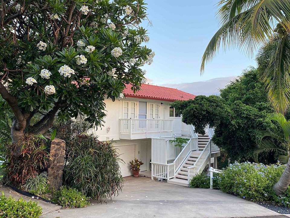 A 1bed/1bath 480 sq ft attached Ohana plus a 2 bed/2 bath 1,352 sq ft main dwelling unit add up to this very special 3 bed/3 bath 1,832 sq ft home. There are two covered lanais, one of 224 sq ft adjoins the main dwelling unit and another of 192 sq ft adjoins the Ohana. Additionally, a wide driveway fronts an oversize two car garage. All is set well off the street behind a lava rock wall and is surrounded by a tropical garden, making this ocean view home a rare find indeed! Surrounded by trees, this unique property resides in a peaceful park like setting, and is yet only minutes from the conveniences of town. Ficus, orchid, palm, lemon, orange, plumeria, papaya and more can be seen from the lanais and many windows throughout the home. The upstairs vaulted ceiling open floor plan boasts 3 recently installed mini-splits and is filled with natural light and island breezes. Step through the 8 French doors onto your expansive, private lanai that extends the entire living space out into an open natural landscape of trees, palms, flowering plants and ocean views. Rest here beneath outdoor lanai ceiling fans for your daily birdsong symphony and nightly sunsets. The large primary bedroom suite has its own balcony with french doors to capture cool evening breezes & Haleakala views. There is also a 2nd extra large bedroom plus a hall bath on this level. The attached ground level 1 bed/1 bath partially furnished Ohana features its own private entrance, a lovely tropical garden setting, a covered lanai, off street parking space, separate laundry area, and its own electric meter. The garage has extra work space and plenty of storage with additional storage under the house. Close to beaches, restaurants, shops, golf courses and more, it’s a spectacular combination of indoor/outdoor living among the treetops.