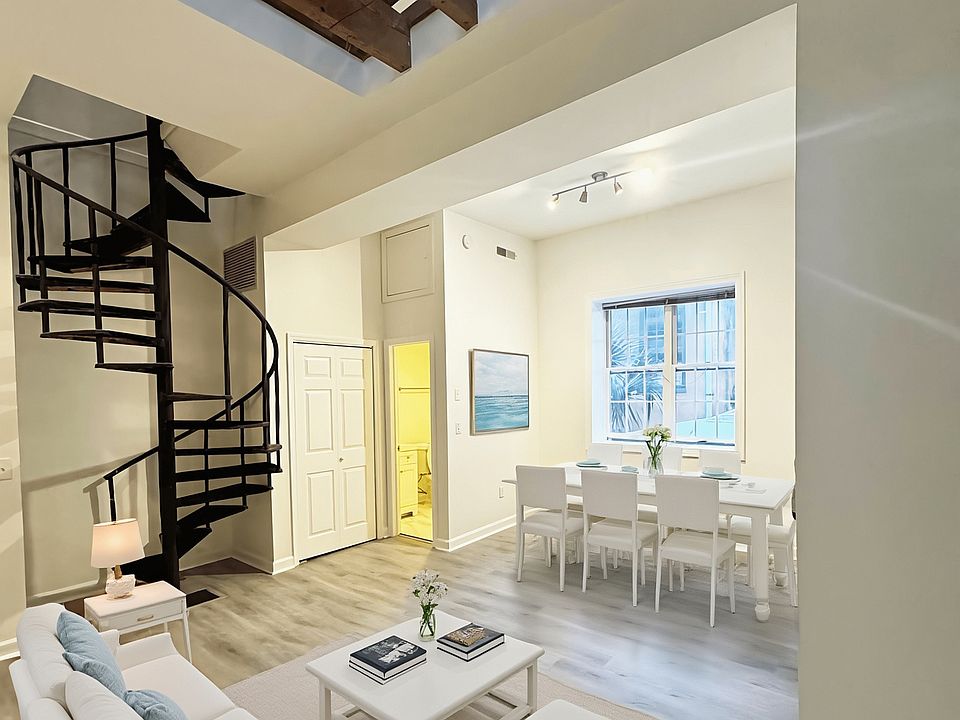 One dedicated parking spaceSpiral staircaseSecurity buildingHigh ceilingsLarge walk-in closet upstairsNewly renovated loftCentral heat and air