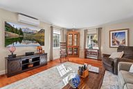 Shaker-style cabinetryCedar-sided homeGas heating stoveWooded backdropExpansive rear deckWalk-in closetMini-split system