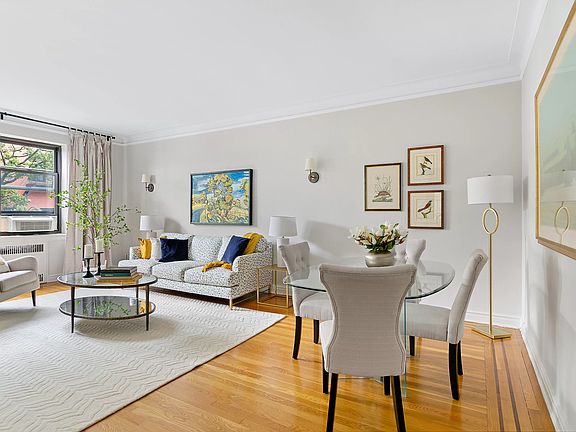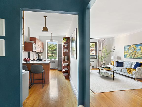 With a gracious layout, pre-war details and modern updates, this stunning two bedroom, one bathroom home is the epitome of elegance and style. Located just two blocks from Prospect Park in a desirable full-service building in prime North Park Slope, it features partial skyline views and soft light from oversized windows throughout. Upon entering, you'll be welcomed by a spacious foyer which anchors the space and seamlessly flows into the sophisticated living room, complete with a dining area for effortless entertaining. Enjoy casual dining in your lovely, windowed L-shaped kitchen featuring plentiful cabinetry with modern brass hardware, a pantry, soapstone countertops, Brizo Litze satin brass faucet with built in water filter, Allia fireclay deep soaking sink and Ann Sacks ceramic penny tile backsplash. This home's two bedrooms are tucked away along a meandering gallery hall and the generously sized private primary bedroom is a serene escape. It easily accommodates a California King, additional lounging room and features a built-out double closet adorned with ornate handles. A charming paned glass door leads you into a perfectly sized second bedroom that is the ideal space for a child's room, guest space or spacious home office. Flanking the bedrooms is the newly updated windowed bathroom featuring a separate tub and stall shower with a rain-head fixture and glass door, along with classic black and white subway tiles, slate tiled floors, a sleek custom vanity topped with soapstone from the same slab as the kitchen counters, and lighting from Schoolhouse Electric. Hardwood floors, high ceilings and charming curved entryways add elegance and a nod to this home's rich history. Centrally located, 235 Lincoln Place is one of the most sought-after prewar co-ops in the neighborhood. Amenities in this pet-friendly elevator building include a doorman, live-in super, bike room, package room, communal laundry room and additional storage. The perfect location is blocks from Prospect Park, Grand Army Plaza, the Brooklyn Public Library, Brooklyn Botanical Garden, Greenmarket, cafes, restaurants, shops and markets. Enjoy easy access to express trains at 7th Avenue and Grand Army Plaza, with the B/Q and 2/3/4 also just minutes away. A special offering which is not to be missed!