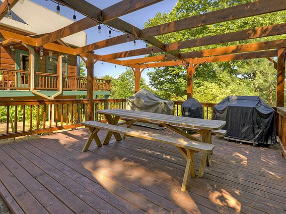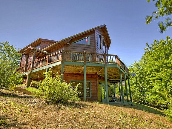 EXQUISITE MASTERPIECE- this prow front features one of the finest views in the North Georgia Mountains...open floor plan featuring a wall of glass that showcases cascades of mountains. Comfy kitchen, updated w/bathroom and king suite on main level. Many outdoor memories await you on the oversized party deck situated perfectly for any occasion including a screened in porch for the times you need a cozy outdoor space. There is an outdoor garage/workshop combo for additional toys and tinkering. This cabin offers a master on each level with a King Master suite upstairs complete with its own private balcony. The terrace level can be made into a complete guest suite with an oversized bedroom combo, kitchenette,closets and a bonus room or great family room or rec area. 10 minutes from Blue Ridge.