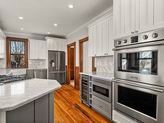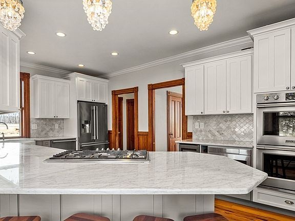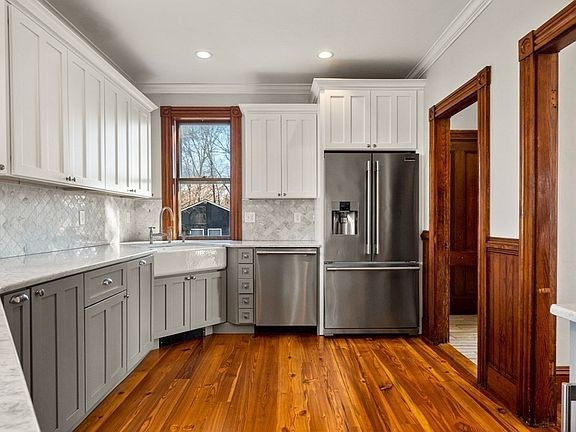 Fantastic, affordable opportunity to live in the bucolic town of Rowley! This home has been lovingly updated and well cared for while still maintaining the charm of yesteryear. Gorgeous remodeled kitchen (2016) with loads of cabinets, Carrera Marble countertops and all new stainless steel appliances, including double ovens, microwave drawer and wine fridge. Soaring ceilings, remodeled bath (2020), wood floors (recently refinished) & period details you will love, including pocket doors & gorgeous detailed molding! Two staircases and additional space available in the WALK UP attic, plumbed & ready for your ideas! The spacious yard with amazing views beckon you for summer entertaining. A heated 2 car garage is currently used as a game room with a separate office and an 8x12 storage shed! You have to see this to believe it! Five year old Septic, five year old Buderus heating system, & 3 year old hot water heater. Showings begin OH Sat & Sun, Jan 30th & 31st, 11-1pm, no appt needed.