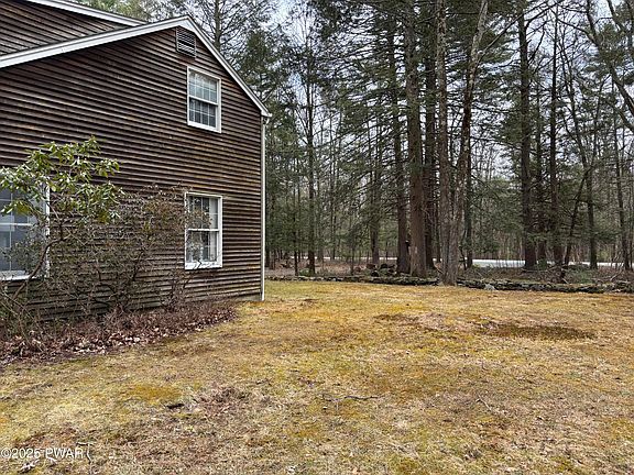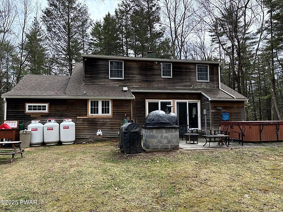 Classic New England Colonial on 4.3 Acres, no community, Wallenpaupack School District and close to Lake Wallenpaupack. Beautiful flat private setting with large yard and plenty of parking. This property has a large detached two car garage with plenty of storage in the walk up second level. In addition there are two large covered storage areas for your RV and toys. This home consists of a half bath, laundry, home office, living, dining and kitchen all on the first level. The second level has a three bedrooms and two full bathrooms. The primary bedroom has its own private bathroom and large walk in closet. Did I mention a hot tub and wood fired pizza oven on your back patio!