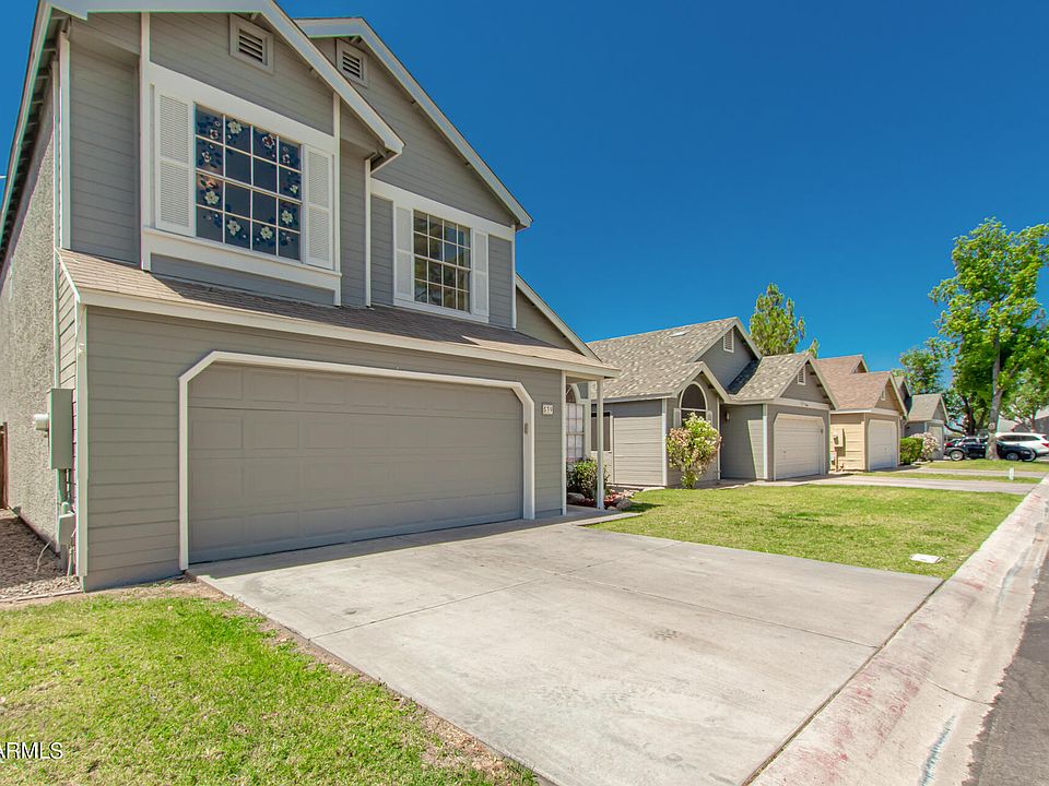 Welcome to your new home in Eastbrook Stratford in Mesa! This charmer features 3 bedrooms, 2 bathrooms, and a 2-car garage. Its design boasts vaulted ceilings enhancing the home's appeal, neutral paint, wood-look flooring throughout, and tons of natural light. The property also provides a cozy family room with sliding door access to the back. The kitchen is outfitted with stainless steel appliances, solid surface counters, open shelves, white cabinetry/drawers, and a sunny bayed window dining area. Upstairs, discover the roomy main bedroom, complete with a private bathroom for added comfort and a walk-in closet. Venture outback to find a backyard with tons of potential to transform into your own private oasis. This is a fantastic opportunity you wouldn't want to miss! Come, see it!