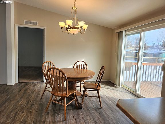 Lovely 3 bedroom, 2 bath home in nice neighborhood in Elgin, OR with double garage & fenced back yard with locking gates! Seller has just installed new flooring in main part of home, new dishwasher & refrigerator and range hood! All appliances stay. The floor plan is great for having people over and the slider leads to a back yard deck for entertaining convenience. Fun architectural details in living room lend to a large, open feeling! Check this home out today - it's ready for a new owner!