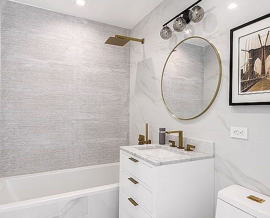 Indulge in the luxurious bathrooms with brass finishes, deep soaking tubs, floor-to-ceiling porcelain natural stone tiling, and rain shower heads. Heated flooring adds an extra touch of comfort and luxury.