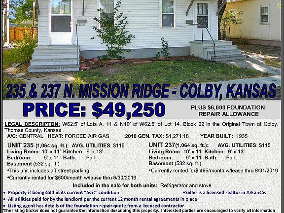 FOR SALE: 235/237 N. Mission Ridge, Colby Kansas. $49,250 with a $6000 foundation repair allowance. This duplex is currently rented with a historically high occupancy rate. Each unit has 1 bedroom, 1 full bath, kitchen, living room, and unfinished basement area. See listing agent for current rates, lease agreements, and foundation repair quote and information.