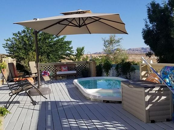 This home is move in ready! Completely remodeled in 2018 The open floor plan allows the perfect spot for entertaining. The kitchen has enough room for 2 chefs at the same time.This 3 bedroom, 2 bath is spacious and calming with natural light from the many windows. The outside decks allow endless possibilities ,starting with the entrance you see the pool and spa and outdoor shower to the right, to the left there is a quiet sitting area with a separate entrance off the master bedroom. Continuing onto the front door .If you pass the front door you over look the grassy yard ,bordered with shrubs and flowers. The yard has a male mulberry shade tree also 1 apple and one peach tree. Crossing over the deck to a separate garden area. Property has a studio with a half bath and separate entrance . That is located in the back of the 2 car garage. This is a Must see Home... Views of Lake Powell....Agent/ Owner