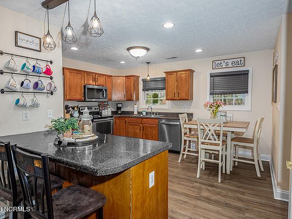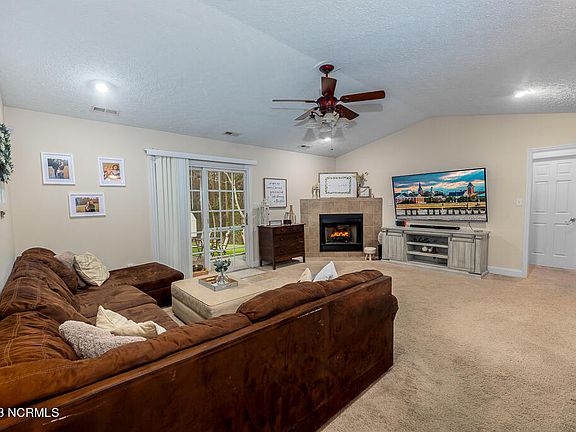 Welcome home to this well-maintained 4-bedroom 2-bathroom home on half an acre in the sought-after neighborhood of Westbrooke. Your large driveway hosts 4 cars, and the side yard can be home for any recreational vehicles or boats. Outside you will find established flower beds and a covered front porch waiting for your ferns and rocking chairs this summer. Inside you will find a foyer that opens up to your large living area with a corner gas fireplace, vaulted ceilings, and recessed lighting. Easily entertain guests at your large breakfast bar while you cook dinner in your eat-in kitchen. The kitchen has a large amount of cabinet and counter space, matching stainless steel appliances, and a pantry. The hallway to the left hosts your laundry closet and two bedrooms. The large primary bedroom boasts of trey ceilings, recessed lighting, walk-in closet, and a private bathroom. The primary bathroom has a large soaking tub/shower combo, LVP flooring, upgraded lighting, and vanity hardware. Bedroom two is right next to the primary and makes a perfect nursery or playroom with a walk-in closet. On the other side of the home, you will find the remaining two large bedrooms with reach-in closets that share another upgraded full-sized bathroom with LVP flooring. This home is perfect for your growing family or visiting guests. Relax on your screened-in back porch, while the grill-master cooks on the concrete patio and the kids or pets play in the fully fenced backyard. The brand-new Graceland shed out back is the perfect size your outdoor equipment and other amenities. There is an additional metal shed on the side yard for more storage. There is a two-car garage with built-in shelving and a large attic for extra storage. Kitchen appliances have all been replaced and upgraded by sellers. The HVAC and gutters were replaced in 2021. Water heater was replaced in 2022. 30-year shingles put on roof in 2006. Conveniently located between the back and front gate of Cherry Point.