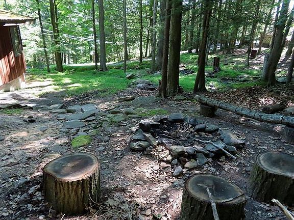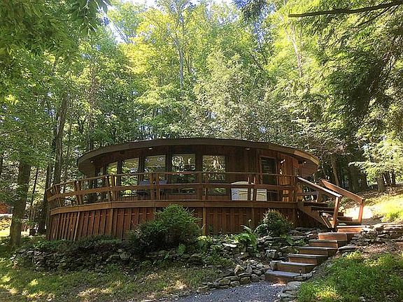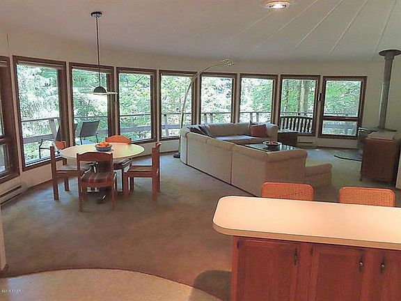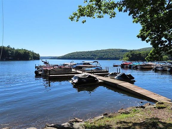 REJUVENATING GETAWAY with a Seasonal Wallenpaupack Lake View AND includes your Boat Slip! You will love the very short walk to Marina, pool, clubhouse and playgrounds. This Cedar sided Round style Ranch with wrapped sun deck is an Architectural Gem. Features natural light, cathedral ceiling with ceiling fan and OPEN Floor concept to arrange the furniture for your viewing pleasure. Enjoy the natural light from floor to ceiling glass and snuggle with warmth of the wood stove. Home comes turnkey furnishings and has new water heater, stove, carpeting, Native stone patio with slate steps, circular stoned driveway and stepping path stones to your campfire ring. CREATED TO ENJOY