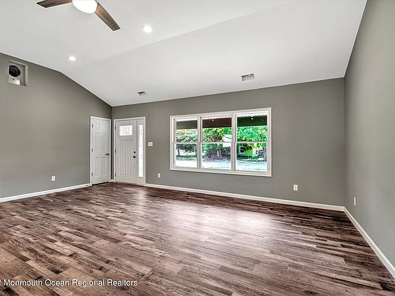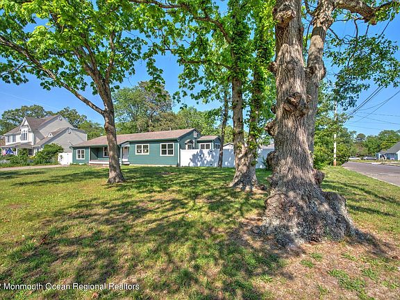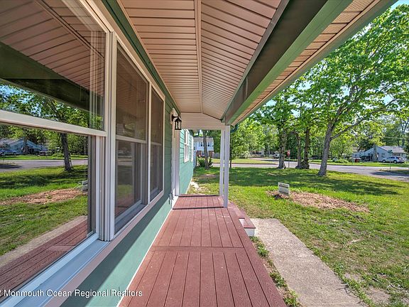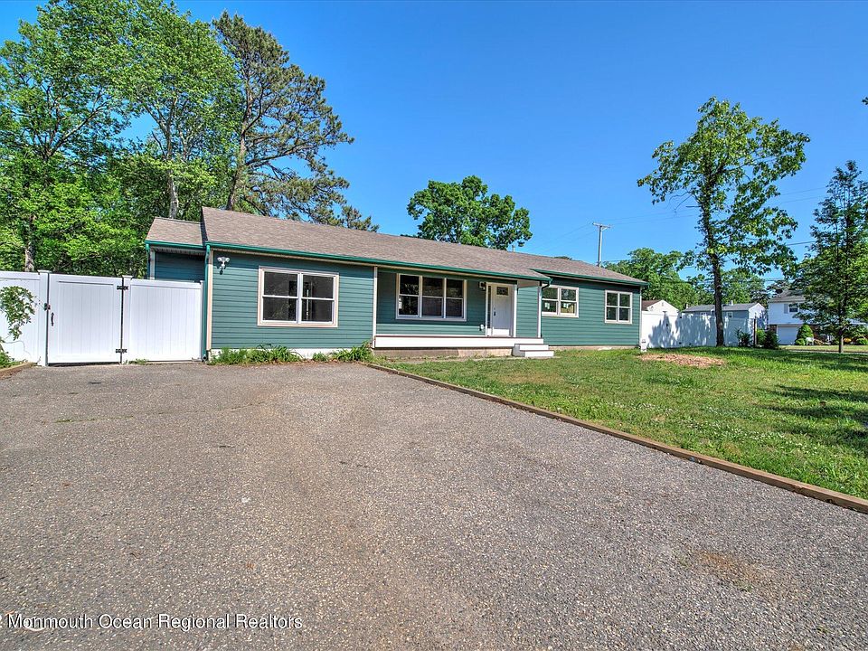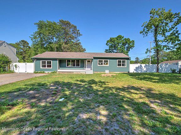 Expanded and completely reimagined 4 bedroom ranch in Bayville on an oversized corner lot in a quiet neighborhood. This impressive home offers a charming front porch, new roof and siding, new windows, new systems and flooring throughout. Features include vaulted ceilings in the main living area, a gorgeous new kitchen with center island, stone counters, stainless appliances and a stylish tile back splash, dedicated living and dining rooms with a sliding door, separate laundry room, plus 3 full modern and sleek bathrooms. Two of the four bedrooms are en suite offering 2 spacious master bedroom concept options. One with a bonus sitting area and the other with a large walk in closet. This is a great option for a large ranch that's completely turn key with a back deck in the fenced in yard.