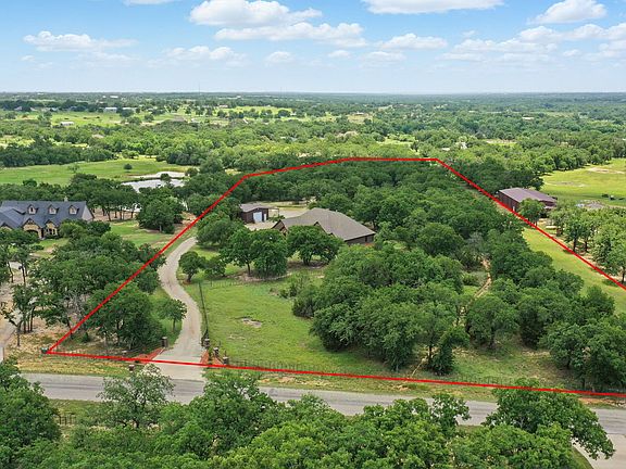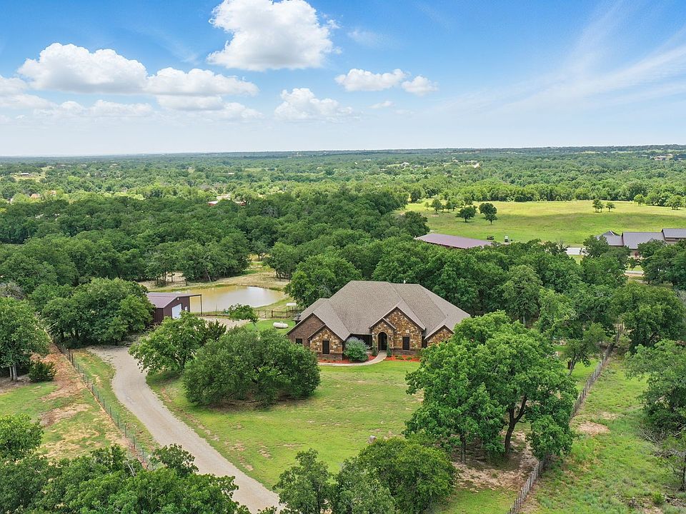 Opportunity awaits for your own private, country retreat in the highly desired community of Peaster. Nestled on over 6 acres, this sprawling brick and stone traditional home offers a rare combination of size and tranquility. Drive into the private driveway to the custom built, almost 2600 square feet residence with its very own stock pond. Step inside the generous foyer of this one level home and you will be greeted by immaculate engineered wood floors and a stone, gas burning, fireplace, creating a warm and inviting focal point for gatherings. The open and airy design, seamlessly connects the living, dining and kitchen areas. The dining room features large windows with views of the natural landscape. The spacious kitchen offers ample granite counter space, a breakfast bar, a gas range, a walk-in pantry and durable tile flooring. The large master suite situated conveniently to the garage entry, offers an extra large bathroom with a walk through shower, soaking bathtub, double sinks and linen storage. The guest bedrooms offer spacious closets and are situated for you guest to have privacy. A second family room has limitless possibilities for additional entertaining space and has french doors leading to the large covered back porch. A half bath and separate laundry room complete this thoughtful layout. Outside the home is the large workshop with an attached carport, offering plenty of space for hobbies, lawn tools or fishing equipment for that stock pond! The expansive acreage remains in its natural stare, providing endless possibilities to add a garden or swimming pool. Additional amenities include a loafing shed, storage building, sprinkler system, gated entrance AND NO HOA all on this AG EXEMPT property! This is a true gem waiting to be discovered!
