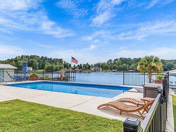 THE ULTIMATE ONE -OF-A-KIND-LAKE HOME! INCREDIBLE VIEWS, SALTWATER POOL, GUEST COTTAGE AND BEST PORCHES ON THE LAKE! This property screams "FAMILY AND FRIENDS" and can SLEEP 16 COMFORTABLY. Red iron supported steel exterior framing with hardy board siding makes this a structural force to be reckoned with! The main home has 2 PRIMARY SUITES on the MAIN LEVEL plus a 3rd bedroom and a huge OPEN LOFT designed with both play space and sleeping space. Open kitchen plan with quartz and custom quality hickory cabinets- vaulted family room w/hardwood flooring. 2nd pantry with extra storage in laundry room. Ice maker conveys to keep the drinks ice cold! Detached DOUBLE GARAGE with charming upper 1 BR 1 BA COTTAGE with full kitchen and laundry! So cute... and the views from the cottage are the BEST! Outdoor living is unmatched here: the street-side party porch (25x50) is the go-to gathering spot for family cookouts, reunions and corn hole while the lake-side porch (10x50) spans the home, overlooking the saltwater pool and level lot. Stocked Koi pond. DOUBLE BOATHOUSE will knock your socks off! Small man cave outbuilding is an extra bonus. Great WATER FRONTAGE, great VIEW, great LOCATION and all the makings for the perfect family gathering place! Closing must take place Nov. 9 or after. Fee simple.