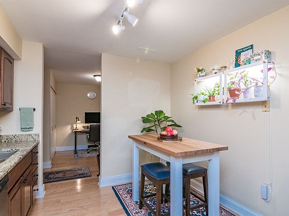 Dedicated laundry closetTastefully updated eat-in kitchenLuxuriously finished bathroomGranite countertopsStainless-steel appliancesSoaring windowsRich wood cabinets