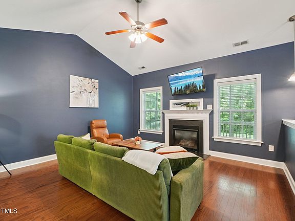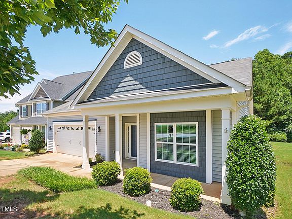 Still showing for backup offers! This charming home offers a thoughtfully designed split-bedroom layout with an open concept living area, perfect for both everyday living and entertaining. Enjoy the warmth of rich hardwood flooring, new carpet in bedrooms and the elegance of smooth cathedral ceilings throughout the main living spaces. The kitchen is a chef's delight, featuring granite countertops, a center island with storage and overhang for seating. Tile backsplash, and stainless steel appliances—including a gas range and refrigerator. The spacious primary suite includes a walk-in closet and a spa-like bath with dual vanities, a separate soaking tub, and a tiled shower. Step outside to relax on the covered front porch or unwind on the rear screened porch overlooking the private wooded backyard . There's also a rear patio ideal for grilling and a storage shed. Additional features include a gas log fireplace, brushed nickel hardware, a laundry room with built-in cabinets, and an attached two-car garage. Located in a desirable neighborhood with community pool and easy access to local amenities!