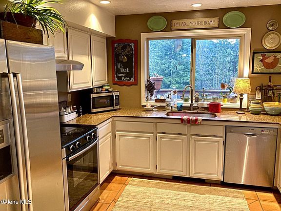 Beautifully updated home only a few miles south of Sandpoint. Quaint neighborhood with lovely North Idaho feel. Amazing views of Gold Mountain right out the kitchen window. Kitchen has granite countertops and modern appliances. Large master bedroom with en suite bathroom. Fenced back yard for privacy. Spacious 2 car attached garage and an additional garage that can be used as a shop. Gas fireplace also heats downstairs.