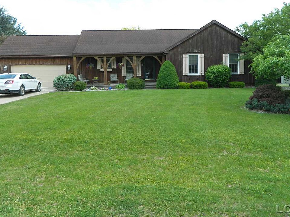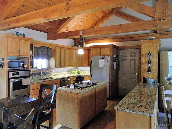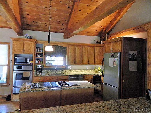 This beautiful 3 bedroom, 2 bath ranch design has so much character to fall in love with! Cathedral ceilings with gorgeous wood beams in the living room that is open to the newly remodeled kitchen with solid surface counters. Nice dining area with wood floors throughout the kitchen and dining area. Kitchen has island with built in cooktop and all stainless steel appliances are included with the home. Large master suite with cathedral ceilings with wood beams, walk-in closet, and a full bath. The basement is finished with huge family/rec room, half bath, 3 other finished rooms, and a laundry room. Absolutely awesome back deck, covered front porch, outstanding yard, and a 29x20 barn! This home has so much to offer, don't miss your chance!