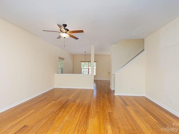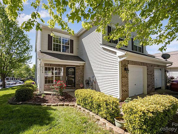 Wonderful END UNIT townhome in a great location with garage! Large living room opens to the dedicated dining room with updated lighting. Kitchen features granite countertops, large island with breakfast bar, plenty of cabinets & pantry for storage! Main floor features hardwood flooring throughout and fresh paint! Spacious primary w/private en-suite, vaulted ceiling and walk in closet. 2 more secondary bedrooms and full bathroom complete the upstairs. The back yard features a fenced patio - great for grilling and entertaining. Home has plenty of storage through out and updated carpet, water heater and HVAC system. The front has a covered porch. Water, trash, and yard maintenance included in HOA fee. Home is an easy commute to Uptown and a few minutes from 485!
