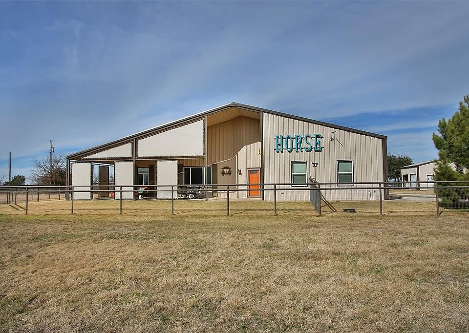 Four-season Barndominium designed for horses and people who live with them by an industry professional. Safe and efficient, allowing time to comfortably spend time with your horses, not doing maintenance. Spacious residence, stalls, tack and storage rooms, wash rack, indoor arena and dog run under one 10,000 sq ft roof. Separate shop building with drive-thru truck and trailer parking, hay storage and RV hook-up. 100 x 215 outdoor arena. 57-ft round pen overlooking the next valley. Co-op water plus an excellent well. Located 3 minutes from horse services and veterinarian. 10 minutes from shopping and restaurant, 30 minutes from Fort Worth. Equipment package available. Call agent for complete amenities list.