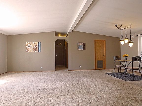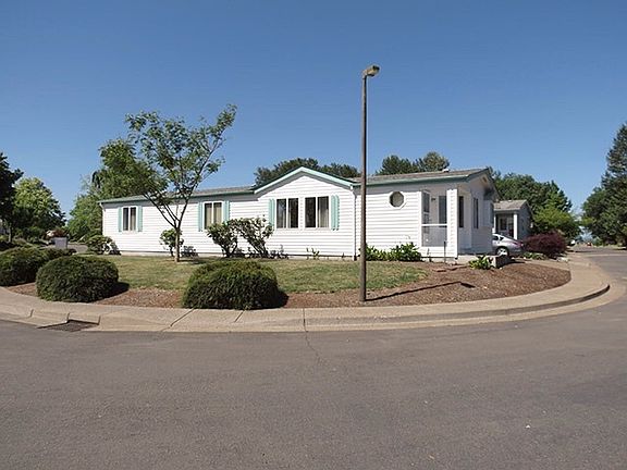 Leased land in Family park: Rosewood Manufactured Home Park. Well built 3 bed/2 bath double wide manufactured home on corner lot. Separate garage/shop with lots of storage. Vinyl windows/siding. Heat pump. Pantry. Laundry room. Vaulted ceilings. Master bedroom with walk in closet and master bath. Automatic sprinkler system. Choose the new carpet with a $2000 Carpet Allowance! Space rent is $497/mo.