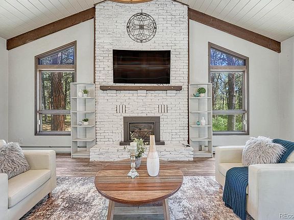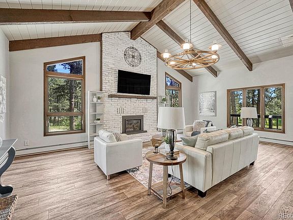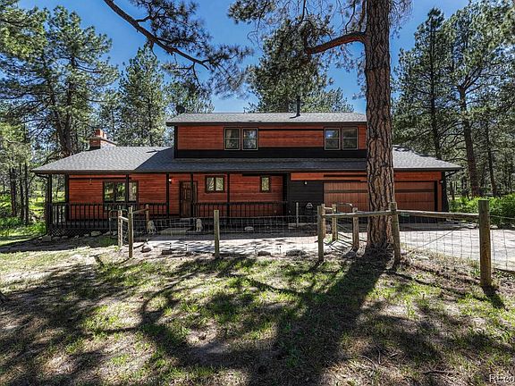 Now offered at $850,000, this serene retreat feels like coming home to a permanent vacation on over 5.5 forested acres in the coveted Russellville neighborhood of Franktown. The only home in the neighborhood under $1MM and closest neighbors sold at $1.04MM.This 4-bedroom, 4-bathroom home offers 2,843 square feet of well-planned living space. The kitchen and bathrooms are all updated and it has recently been painted. Roof replaced in the past 5 years. New septic installed 2024. The walkout basement can be useful as a mother-in-law suite with a large family room, kitchenette, bedroom and bathroom with a shower. Enjoy the expansive deck, perfect for entertaining, and take in the tranquil, treed views. The property features a new chicken coop, attached oversized garage, walkout basement, additional shed/outbuilding, play set, and a private dog run. This home is the epitome of comfort and Colorado living. Come take a look!