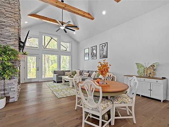 Welcome home! Experience one-level living at its finest in this open-concept ranch home, where every detail has been thoughtfully curated. From the seamless hardwood floors to the vaulted ceilings with soaring beams, this home is the true definition of open-concept living. Marvel in a chef's dream kitchen boasting a spacious quartz island, abundant cabinetry, luxurious lighting, and all stainless steel appliances, perfect for fixing up large meals or entertaining. You'll love nestling up in the cozy living room next to your grand floor-to-ceiling stone fireplace. Take in the breathtaking views from the large daylight windows, overlooking a wooded backdrop providing natural light and privacy unmatched. The extended patio is perfect for outdoor relaxation and entertainment and offers a hook-up for a future hot tub. Retreat to the main level's primary bedroom for utmost comfort, with the added convenience of an adjacent laundry room. The main level offers two other additional bedrooms and a full bathroom. The fully finished daylight basement is a haven of possibilities. It features a cozy second living area, a fourth bedroom, a wet bar for entertaining, a dedicated office space for productivity, and a full bathroom for guests' convenience. Nestled in the coveted Eagle Creek subdivision, just a short walk away from the pool. This one-owner home and former SAB construction build offers better-than-new construction finishes at a price you can say YES to! Look no further, your dream home has arrived!