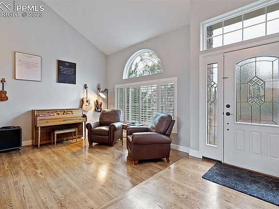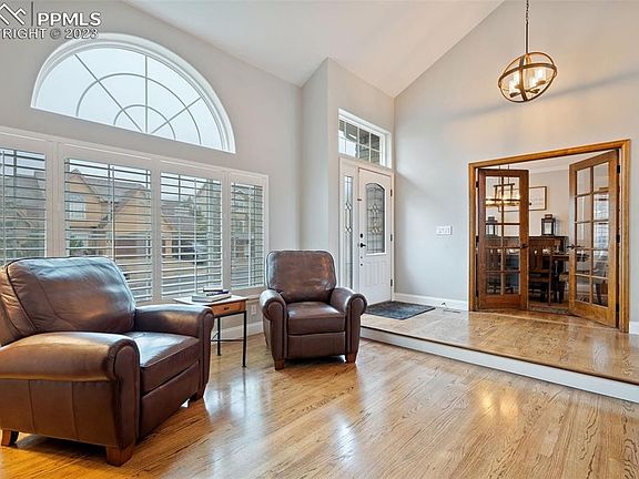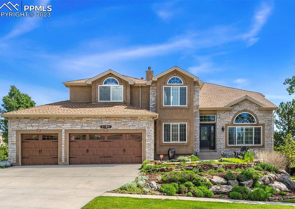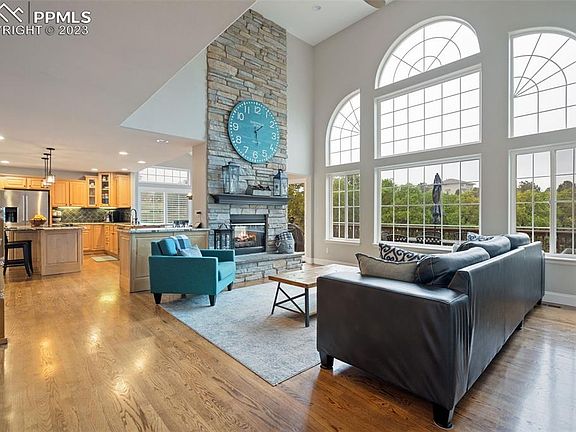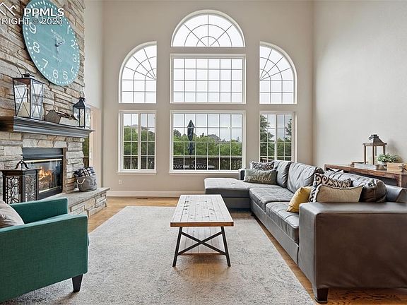 Stunning residence situated on over a half-acre in Mountain Shadows offering mountain & city views and unparalleled privacy. With 5 BR, 4 BA the open floorplan and outdoor living spaces make this home ideal for entertaining. The beautiful landscaping and flagstone patio welcome you. Extensive hardwood flooring leads you into the inviting living room. The spectacular great room boasts soaring ceilings, floor to ceiling stone fireplace and large windows that flood the room with natural light. A Gourmet’s delight, the kitchen features granite slab counters, generous cabinet space, stainless steel appliances, fireplace, and adjoining dining nook. Enjoy entertaining in the elegant dining room beautifully appointed with crown molding. French doors lead to the office offering distracting views and a quiet work space or could be used as a main level bedroom. The luxurious primary retreat provides a dual sided fireplace, five-piece bath with spa shower and walk-in closet. Unwind in the cozy loft, a perfect place to cuddle up with a book. Two spacious bedrooms and a full bathroom complete the upper level. The beautifully finished basement opens to a sprawling family with billiards/gaming area & fireplace along with another bedroom and bathroom. The huge storage room offers tons of space to organize your belongings. With no rear neighbors, you will love the serenity of towering trees, privacy, and wildlife. Enjoy evenings star gazing as you are gathered around the firepit. Access miles of hiking and biking trails at Garden of the Gods or Ute Valley Park. This home is conveniently located to I-25, with easy access to schools, shopping & dining. Lovingly cared for, this home features extensive hardwood flooring on the main and upper levels, updated lighting, newer paint, many new Pella windows and sliding door, plantation shutters, new furnaces and air conditioning unit, tankless water heater. Surrounded by natural splendors and incredible amenities, your sanctuary awaits!