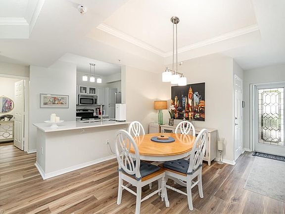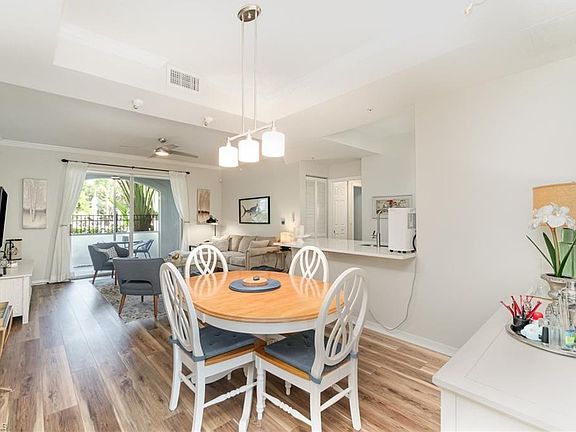 Beautifully updated and rarely available, this 1-bedroom, 1-bathroom condo with an attached 1-car garage in Mirasol at Coconut Point offers effortless living, modern upgrades, and exceptional convenience in a prime Estero location. Enjoy living across the street from the shops and restaurants at Coconut Point—where everything you need is right at your fingertips! This ground floor residence features wood-look plank flooring throughout, crown molding in the living area, and a tray ceiling in the dining room for added sophistication. The modern open kitchen boasts gray cabinetry, sleek white quartz countertops, a breakfast bar, stainless steel appliances, and an under mount stainless steel sink with an upgraded faucet. The spacious bedroom, also featuring wood-look flooring, includes cellular blackout shades and a large walk-in closet, while the luxurious ensuite bathroom impresses with a gray dual-sink vanity with drawers and marble countertops, white tile backsplash, dual mirrors, widespread faucets, and a floor-to-ceiling tiled shower with a rain head, niche, and sleek glass panel. Relax on the tiled, screened lanai overlooking the sparkling pool. Additional highlights include impact windows, a decorative stained-glass entry door with shade and a front door phantom screen, along with a newer AC (2022). The building roof was also replaced in 2022 .Mirasol residents enjoy resort-style amenities including a heated pool with cascading waterfall, covered spa, bocce court, grill area, fitness room, billiards, and a social room with kitchenette. Conveniently located near US 41, this condo offers easy access to RSW International Airport, the Gulf beaches, and Naples. Nearby favorites include Riverside Park, local breweries, farmers markets, and the Sugar Shack live music venue. Plus, it’s only minutes from the upcoming Estero Entertainment District featuring walking trails, sports fields, and pickleball courts—making this an exceptional opportunity to own a move-in-ready condo in one of Estero’s most vibrant locations!