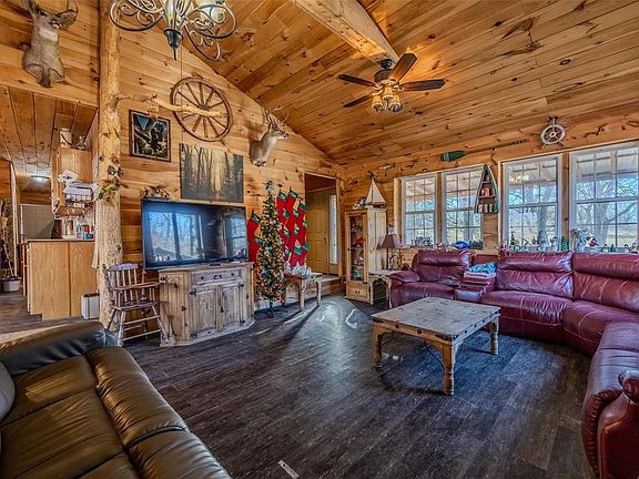 RUSTIC STYLE CABIN ON ALMOST 10 ACRES!!! You will find a lot of woodwork detail, a GORGEOUS LIVING ROOM with vaulted ceilings, an efficient wood fireplace, and a neat kitchen with the main appliances included; the location is ideal, too. It is just a few miles from hospitals and stores but outside the city limits with a country setting, paved road, and no restrictions!! Make this your MINI FARM. The additional older building is large and serves well for storage with electricity and two rolling doors for convenience. There is some wooded land by the wet weather creek. The property is fenced on three sides and welcomes wildlife. You will love the fabulous front-covered porch, the back deck, and the serene view of the pond. The cabin needs some final projects and details for you to finish, but all the major work has been completed!
