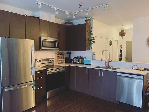Corner condoHigh ceilingsPrivate covered balconyOpen kitchenBrand-new appliancesIn-suite washer and dryer