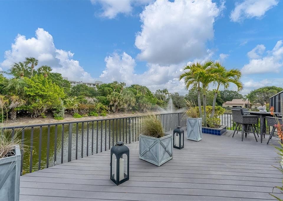 An exquisite coastal-modern renovation has been completed in this very spacious Longboat Key Club — Bay Isles Villa, Seller will credit $75,000. towards a new roof and this beautiful home offers three bedrooms, two-and-a-half baths, 2,487 square feet of interior space with over 950 square feet of additional outdoor living overlooking an east-facing peaceful pond and two fountains. There is also the added bonus of a two-car garage with brand-new epoxy floor, double water heaters, Kineco water conditioning system and a separate inside laundry room. Every detail has been well-thought-out, from the automated blind system to the 8-inch baseboards, new interior doors, custom built-in closets, fog-proof vanity mirrors, coastal long-plank porcelain flooring and stunning white quartz countertops accenting the designer-inspired chef’s kitchen. Mood LED lighting throughout, custom modern ceiling fans, crystal chandelier and a custom-glass lighted accent mural separate the dining room from the kitchen. The extras continue with a primary bath suite featuring a 10-jet jacuzzi soaking tub, double vanities, and a rainforest shower with four in-wall jets and custom LED lighting to enhance your experience. The primary bedroom and the great room open up to an oversized screened-in lanai with hardy plank flooring, and the great room centers around a wood-burning fireplace with direct access to the wine and coffee bar. There is a place for everything within this one-level with minimal steps villa, and a large second ensuite bedroom featuring a private atrium and access to the third bedroom that is currently being utilized as an office. Imagine grilling and relaxing on your expansive outdoor decks while enjoying the peaceful water views. Bay Isles is located on the beautiful island of Longboat Key, inside the gates of the Longboat Key Club, which offers membership opportunities to golf, tennis or social. Living in Harbour Oaks 2 provides you with a 24-hour guarded gate, exclusive access to the private Bay Isles Beach Club, miles of shaded sidewalks for walking and cycling with the marina and grocery store located very close by. Just over New Pass Bridge, residents can enjoy Mote Marine and the dining and shopping of the world-famous St. Armands Circle. You will not be disappointed.