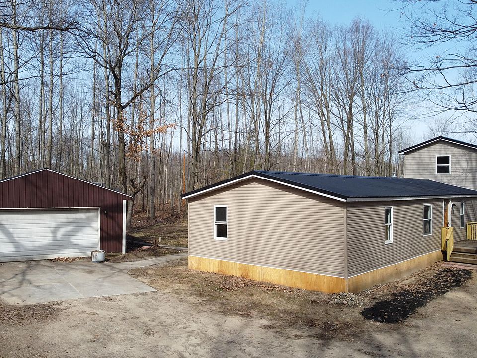 Doublewide has undergone extensive interior remodeling and updating, and also features a two story, 2 room addition dating back several years. Property consists of almost 30 secluded acres which was select cut for timber about 3 years ago, so lots of firewood if you want to install outside wood boiler for heating system. Oversized pole barn garage could easily accomodate more than 2 cars, or large work area, garage needs interior updating. Shared driveway.