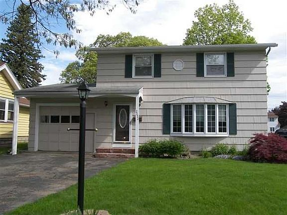 Spacious Colonial in Irondequoit! Wait till you see this lovely 3 bedroom, 1.5 bath Colonial with living room featuring a Bow Window and lovely Hardwood floors, dining room, eat in kitchen with snack bar, newly renovated powder room, newer windows, lower level partially finished, deck, patio, fenced yard, shed, central air, attached garage with additional garage door rear access with convenient location. Convenience Plus! A lovely home!
